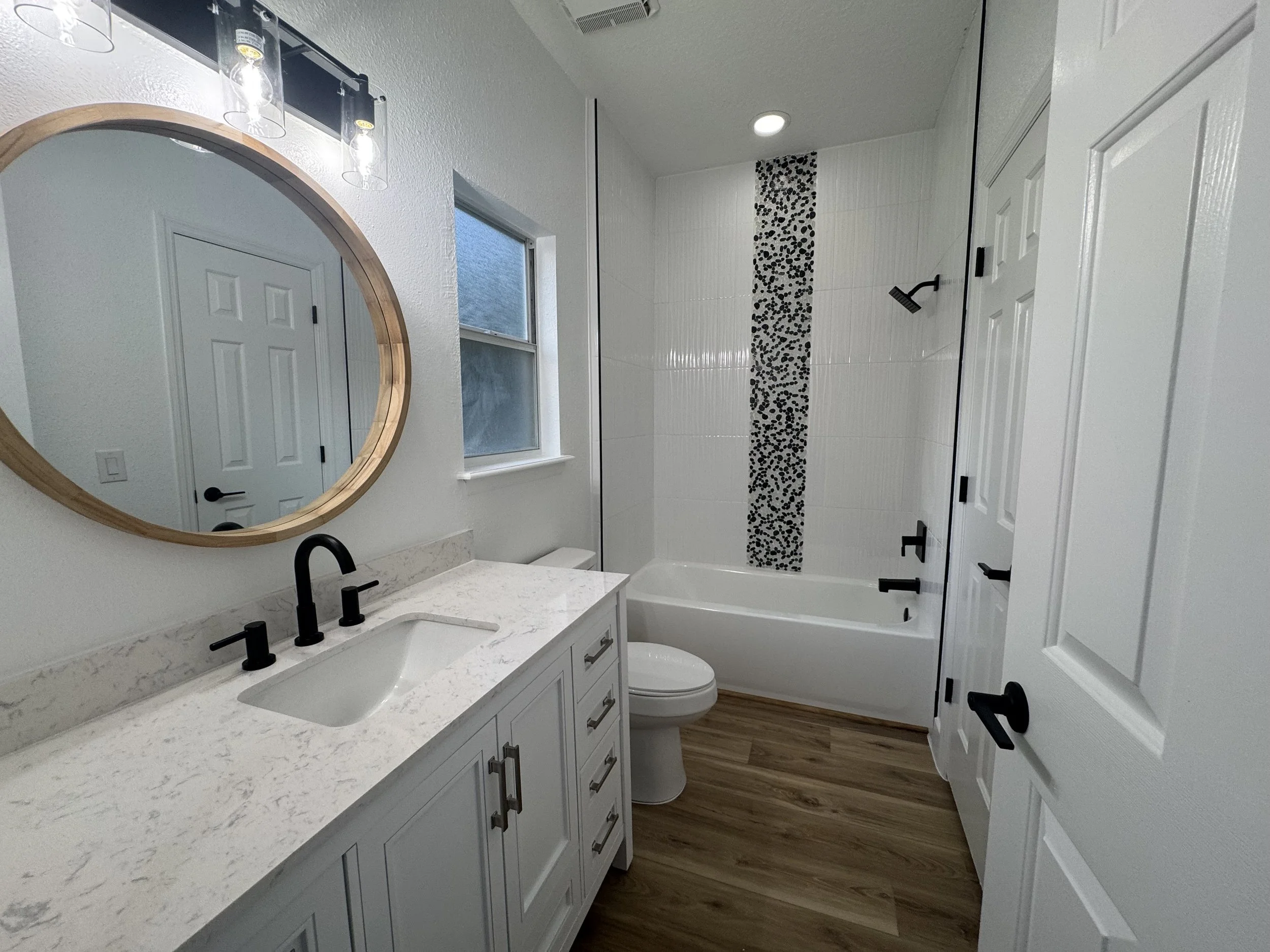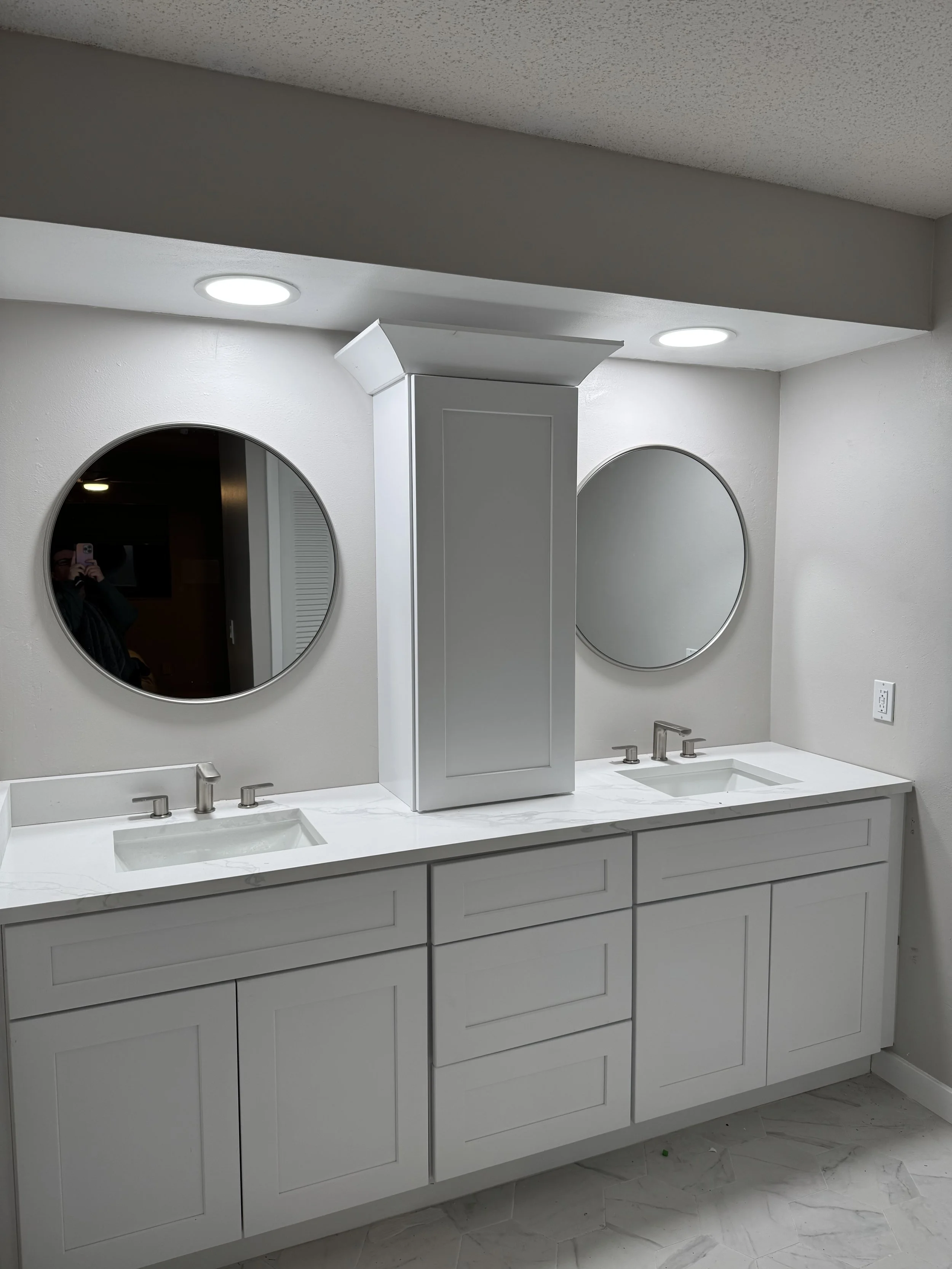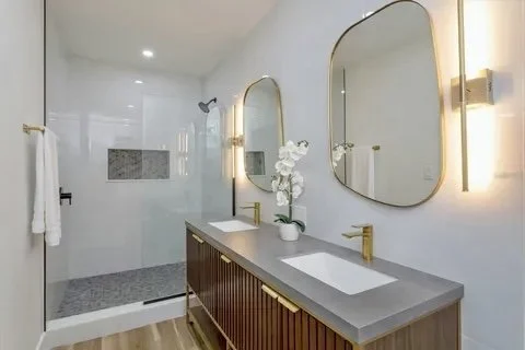 Vanities, tile, plumbing fixture updates, lighting, mirrors, and finish work.